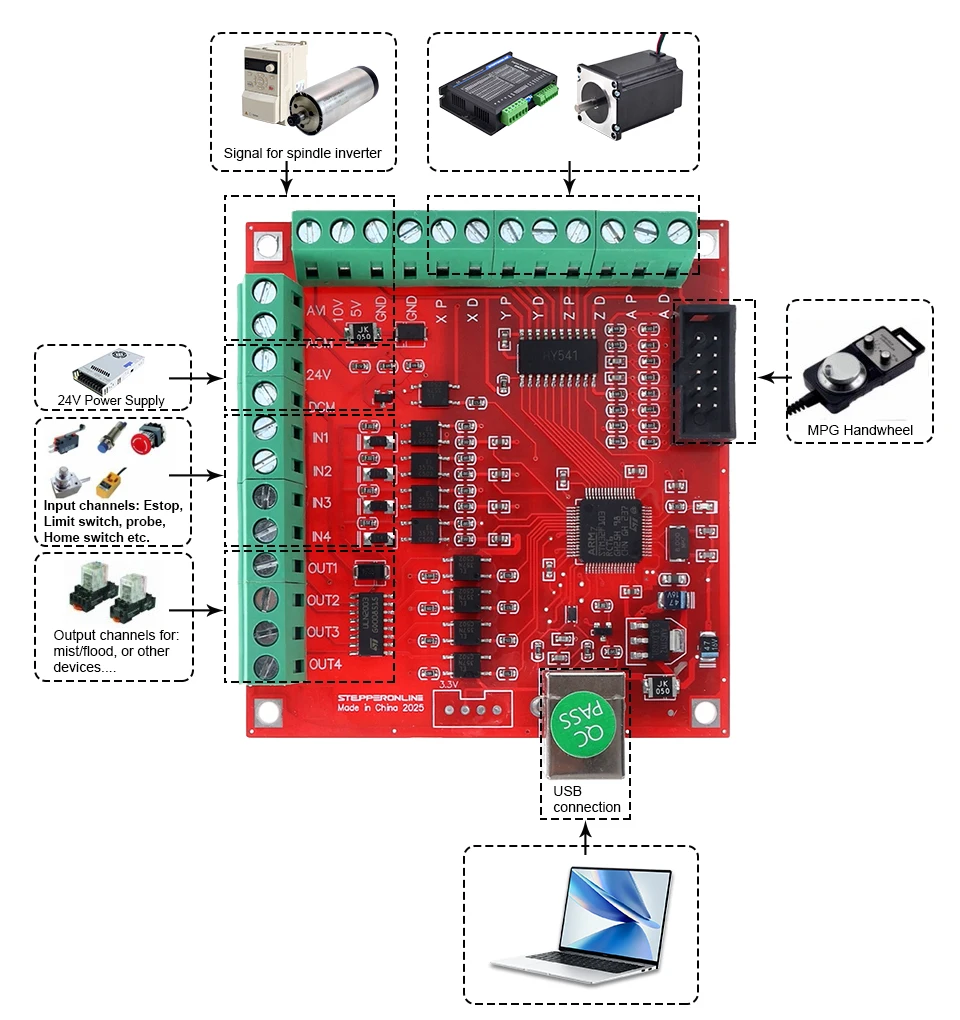 Das Gerät verfügt über ein treiberfreies Design, das über das ST-USB-C-USB-Kabel mit Strom versorgt und gesteuert wird, und ist mit allen Versionen von Mach3-Software und Windows-Systemen kompatibel.Der ST-V3 unterstützt bis zu 4-Achsen-Synchrone Bewegungssteuerung und kann Spindelmotoren über PWM-Signale regulieren, wodurch er für kleine CNC-Maschinen wie Gravierer geeignet ist.