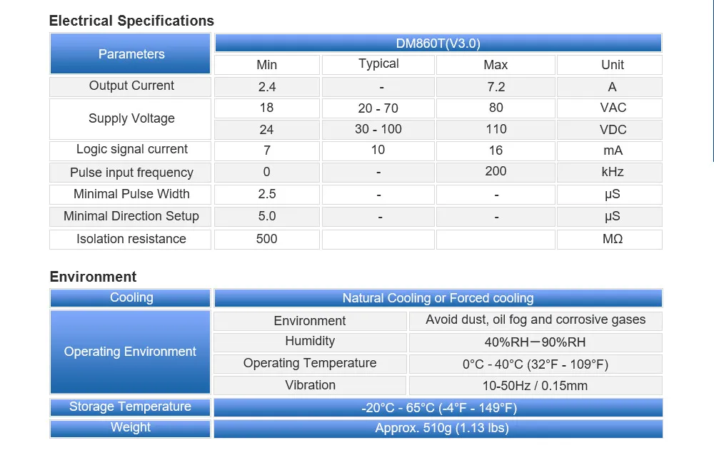 Microstep(Steps/rev.): 400 - 51200